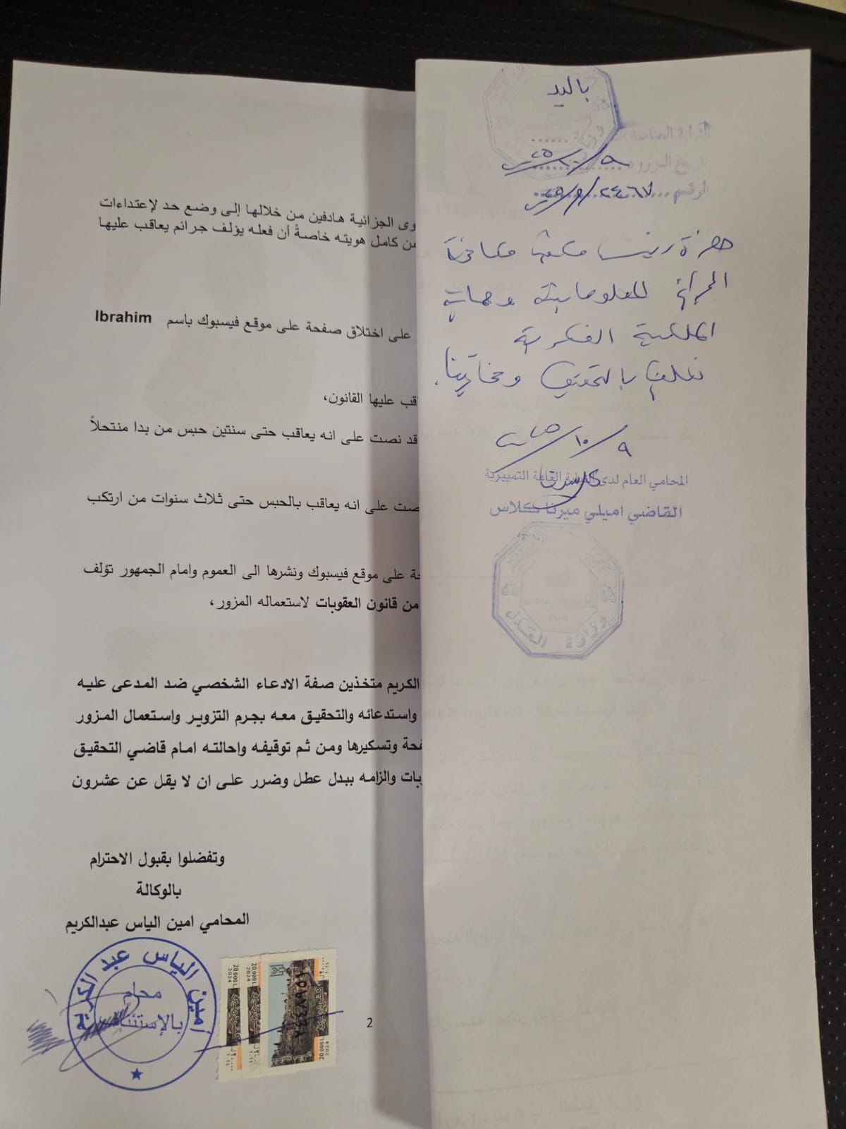تقدّم النائب ابراهيم كنعان بواسطة وكيله المحامي أمين عبد الكريم بشكوى امام النيابة العامة التمييزية، بتاريخ ٩/١٠/٢٠٢٥، بانتحال صفة والتزوير واستعمال مزوّر  وتصل عقوبتها الى ٣ أشهر سجن بموجب المادة ٣٩١ من قانون العقوبات، وذلك ضد من أنشا صفحة على فايسبوك كتب عليها "Ibrahim Kanaan- القوات اللبنانية الحرة".