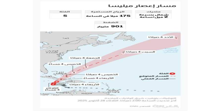 من المتوقع أن يتحرك مركز إعصار ميليسا قرب جامايكا أو فوقها يوم الثلاثاء، ثم يعبر جنوب شرق كوبا صباح الأربعاء، ثم يعبر جنوب شرق أو وسط جزر البهاما في وقت لاحق من يوم الأربعاء، وفقًا لمركز الأعاصير .