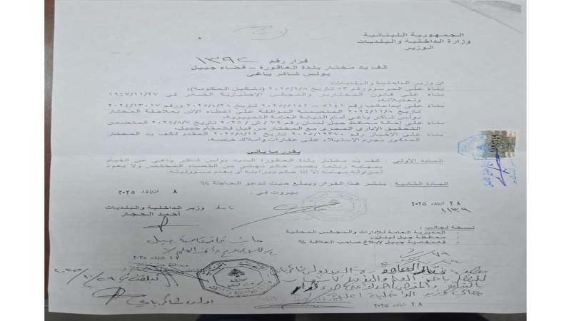 أفادت معلومات الجديد بأن “وزير الداخلية أحمد الحجار أصدر قراراً بكف يد مختار العاقورة بولس ياغي بجرم الإستيلاء على عقارات وأملاك خاصة”.