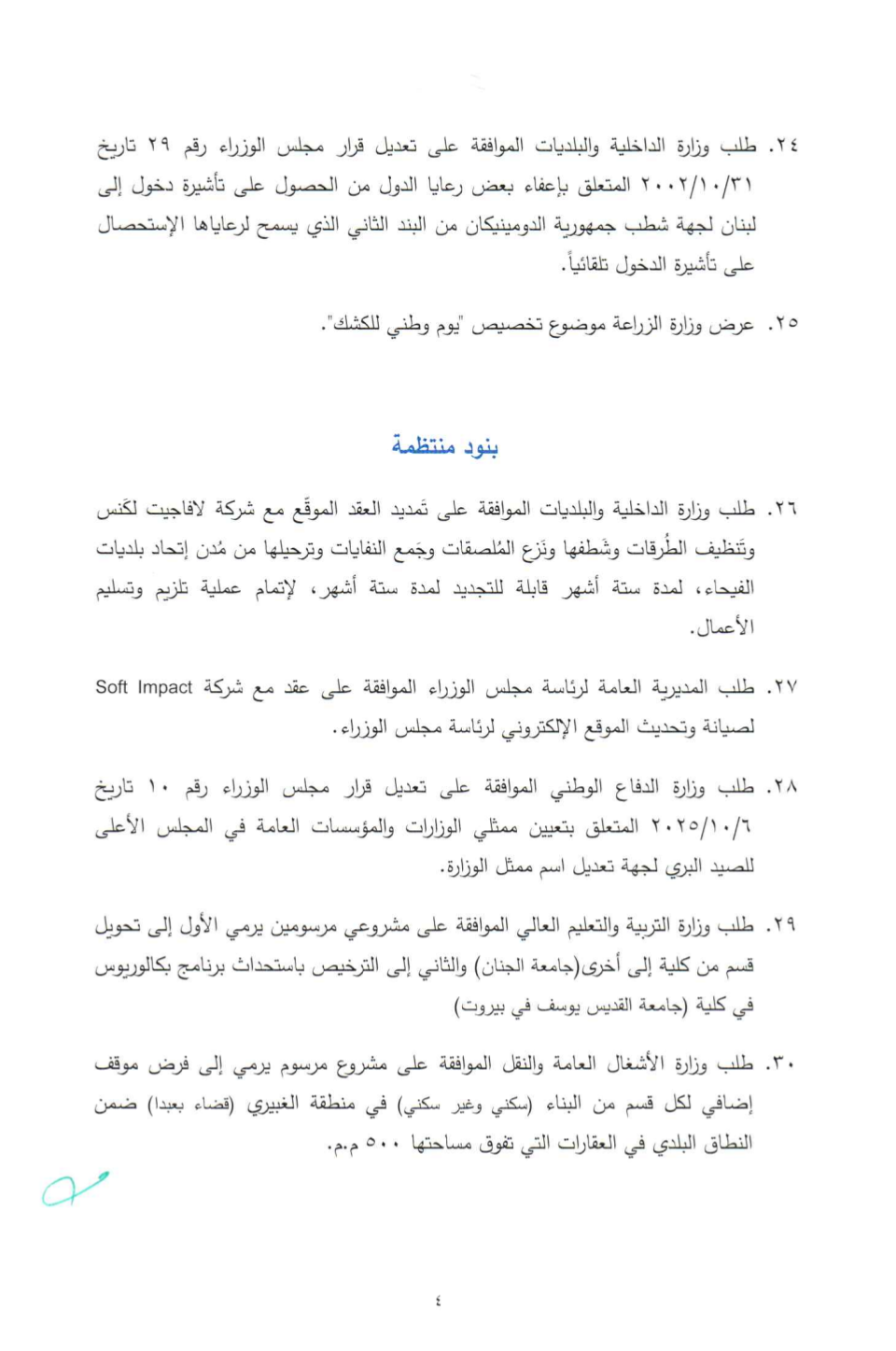 يعقد مجلس الوزراء جلسة عند الساعة الثالثة من بعد ظهر يوم الخميس الواقع فيه 6-11-2025 في القصر الجمهوري.
