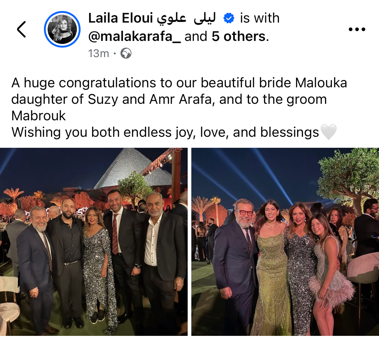 ونشرت ليلى علوي الصور على حسابها الشخصي بموقع فيسبوك وعلقت عليها قائلة: "ألف مبروك للعروسة ملوكا بنت سوزي وعمرو عرفة، وللعريس مبروك. نتمنى لكم حياة مليئة بالفرح، الحب، والبركة"