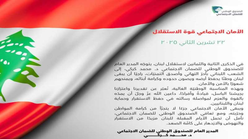 بمناسبة حلول عيد الاستقلال، توجّه المدير العام للصندوق الوطني للضمان الاجتماعي الدكتور محمد كركي ببطاقة معايدة الى المضمونين واللبنانيين، بعنوان: “الأمان الاجتماعي قوة الاستقلال”.