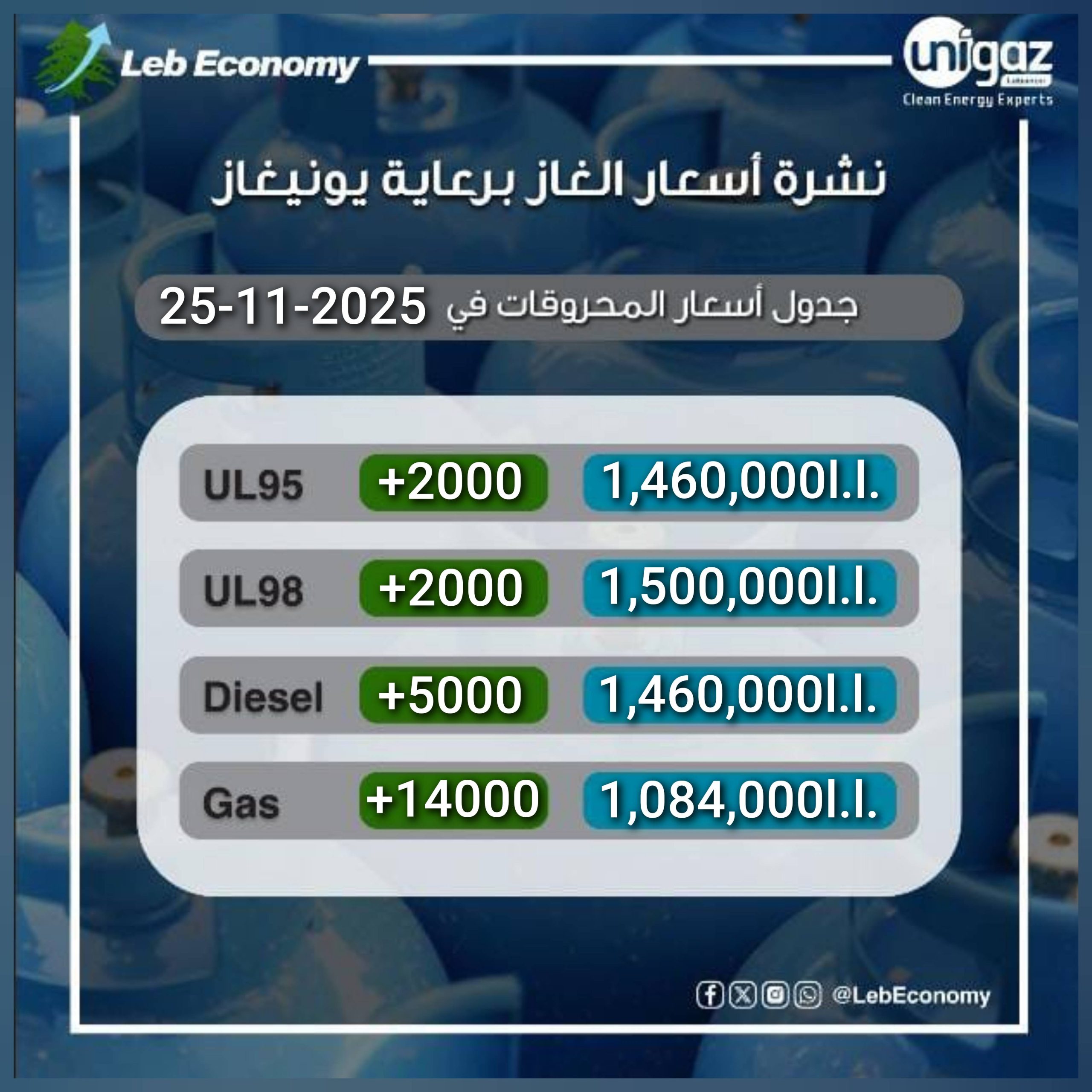 أظهر الجدول الجديد لأسعار المحروقات في لبنان والذي صدر اليوم في 25 تشرين الثاني 2025، ارتفاعاً بسعر قارورة الغاز قدره 14000 ليرة.