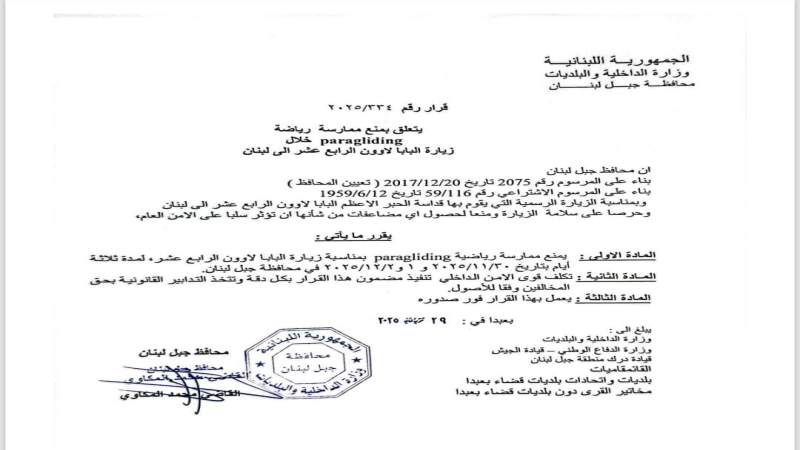 أصدر محافظ جبل لبنان القاضي محمد المكاوي قراراً يتعلّق بمنع ممارسة رياضة الـ paragliding خلال زيارة البابا لاوون الرابع عشر إلى لبنان.