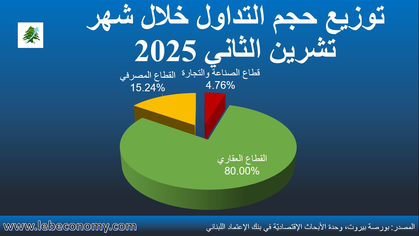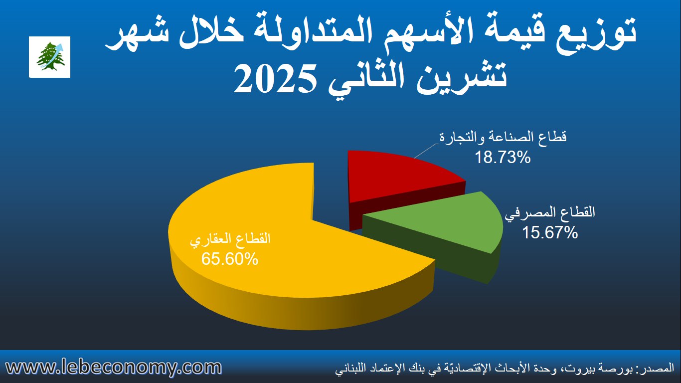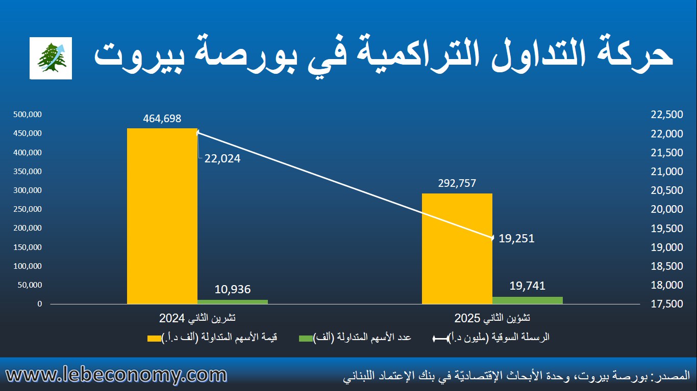 أمّا على صعيدٍ سنويٍّ، فقد إرتفع عدد الأسهمُ المُتداوَلة على بورصة بيروت بنسبة 80.52% في الأشهر الإحدى عشر الأولى من العام 2025 إلى 19.74 مليون سهم فيما إنخفضت قيمة الأسهم المتداولة بنسبة 37.00% إلى 292.76 مليون د.أ. وقد تراجع المتوسِّط المثقَّل للسعر على القيمة الدفتريّة (P/Bv) للأسهُم المُدرَجة إلى 6.091 في نهاية شهر تشرين الثاني 2025، مقابل 6.126 في شهر تشرين الأوّل علماً أنّه كان قد إستقرّ عند مستوى 7.643 في نهاية تشرين الثاني 2024 عندما أقفلت أسعار التداول في أسهم سوليدير “أ” و”ب” عند مستوى 93.35 د.أ. و94.10 د.أ. بالتتالي مقارنةً بأسعار إقفال بلغت 76.55 د.أ. لأسهم سوليدير “أ” و75.55 د.أ. لأسهم سوليدير “ب” في نهاية الشهر الحادي عشر من العام الحالي.