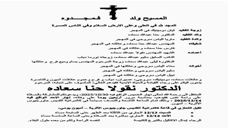 كتب النائب السابق سليم عبدالله سعاده كلمة وداع تمزج بين لوعة الفقد ووقار الرسالة، مودِّعًا ابن أخيه الشاب، الطبيب نقولا حنّا سعاده، الذي خطفه الرحيل في لحظة كان فيها العمر مشرعًا على الضوء: