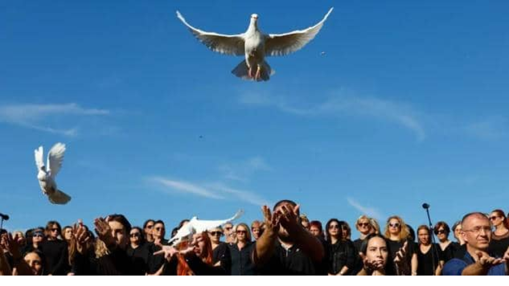 تظهر في الصورة حمامة بيضاء كبيرة وتبدو وكأنها معلقة دون شيء فوق مجموعة من الناس، الذين يفتحون أيديهم وهم يطلقون الطيور في الهواء في صربيا في الأول من نوفمبر/ تشرين الثاني.