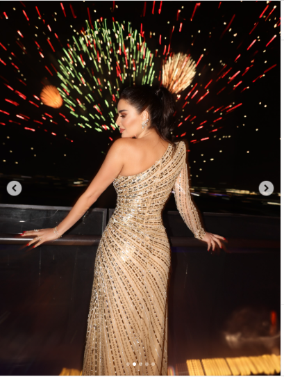 تألقت سرين عبد النور في الصور بإطلالة راقية، حيث ارتدت فستان طويل اتسم بصيحة الكم الواحد التي تتصدر احدث صيحات الموضةواتسم باللون البيج المطرز بالكامل.