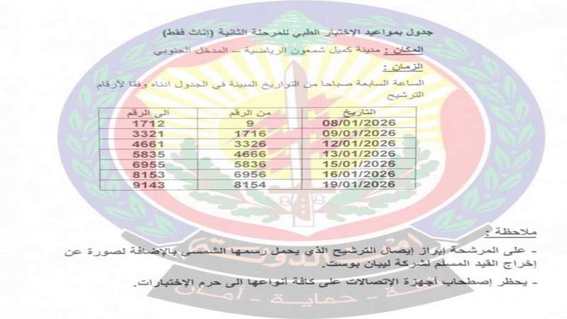 وأشارت المديرية إلى ضرورة التزام المرشّحات بالحضور مصطحبات المستند المطلوب الصادر عن شركة “ليبان بوست”، والمتضمّن الرسم الشمسي الخاص بالمرشّحة، إضافة إلى نسخة عن إخراج القيد، مع التشديد على التقيّد التام بمنع إدخال الهواتف الخلوية أو أي معدّات إلكترونية إلى داخل حرم إجراء الاختبارات.