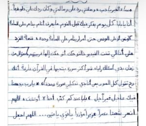“مساء الخير يا حبي، وصلني ردك على رسالتي وكان ردك عليّ حلو طبعًا. أنا يا بابا كل يوم بفكر فيك قبل النوم ما بعرف أنام، بنام على الساعة 12 ونص أو على 11 ونص حتى أحيانا بنام على الساعة وحدة.