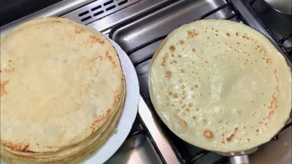 يجب تحضير طاسة غير لاصقة ونقوم بدهنها بقليل من الزيت ثم نضيف كمية صغيرة من الخليط بواسطة كوب معياري ونفرد الخليط ونتركه لمدة 30 ثانية ثم نقوم بتسويته على الوجه الآخر لمدة 30 ثانية أخرى.