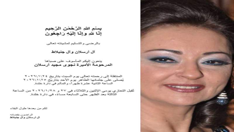 نعى آل أرسلان وآل جنبلاط المرحومة الأميرة نجوى مجيد أرسلان التي غيّبها الموت اليوم السبت. يصلى على جثمانها الساعة الثانية عشرة من ظهر غد الأحد، والمأتم في دارة خلدة.