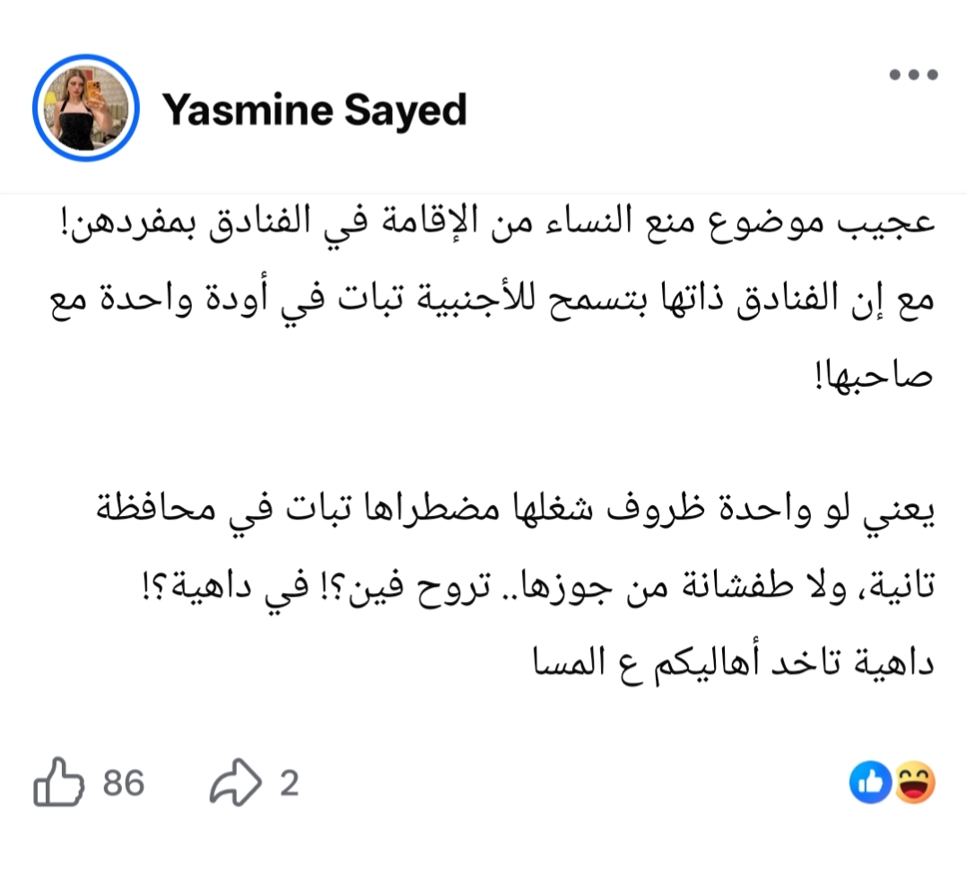 وكتبت ياسمين الخطيب:لو واحدة طفشانة من جوزها تروح فين،عجيب موضوع منع النساء من الإقامة في الفنادق بمفردهن! مع إن الفنادق ذاتها بتسمح للأجنبية تبات في أوضة واحدة مع صاحبها!.