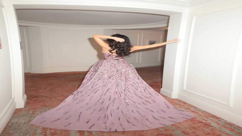 وجاء الفستان الوردي بقصة جريئة من عند الساق، مطرزاً بلمعان الترتر والكريستال في كل تفاصيله، فيما تحدد الخصر بحزام معدني لافت أبرز القوام.