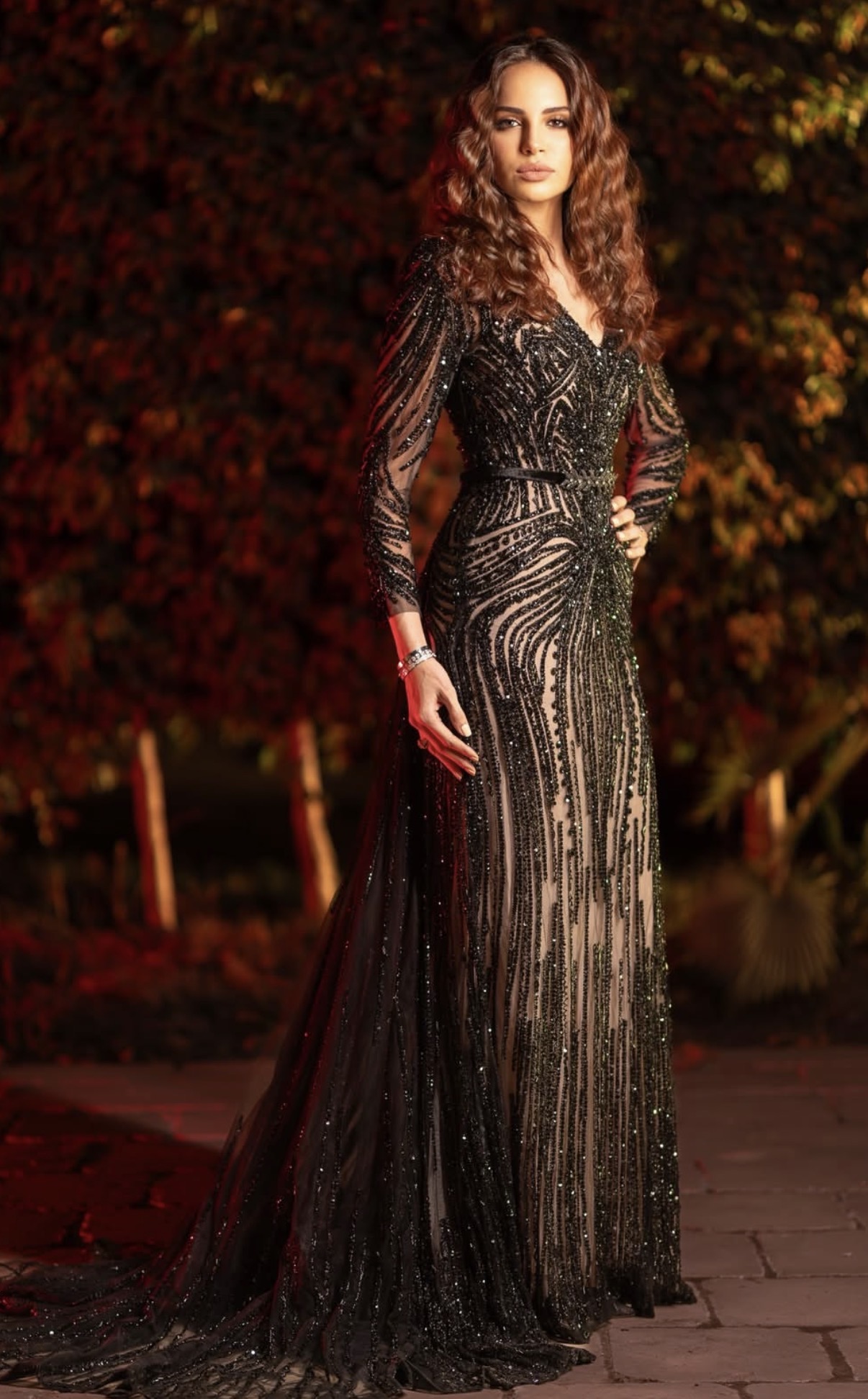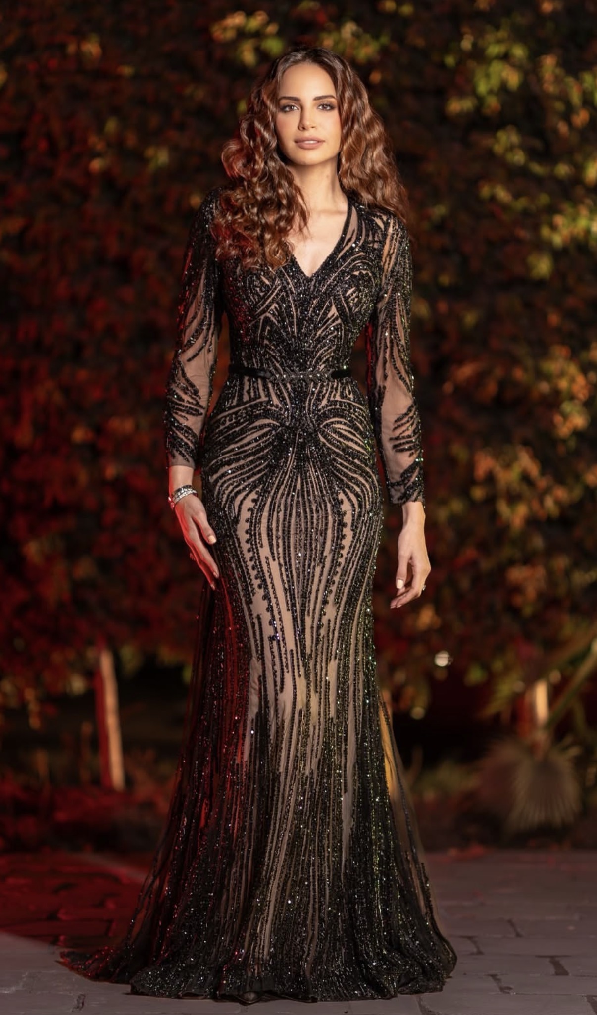 تألقت آمال ماهر في الصور بإطلالة كلاسيك، حيث ارتدت فستان طويل ذا أكمام طويلة واتسم التصميم بالقماش المطرز بالكامل.