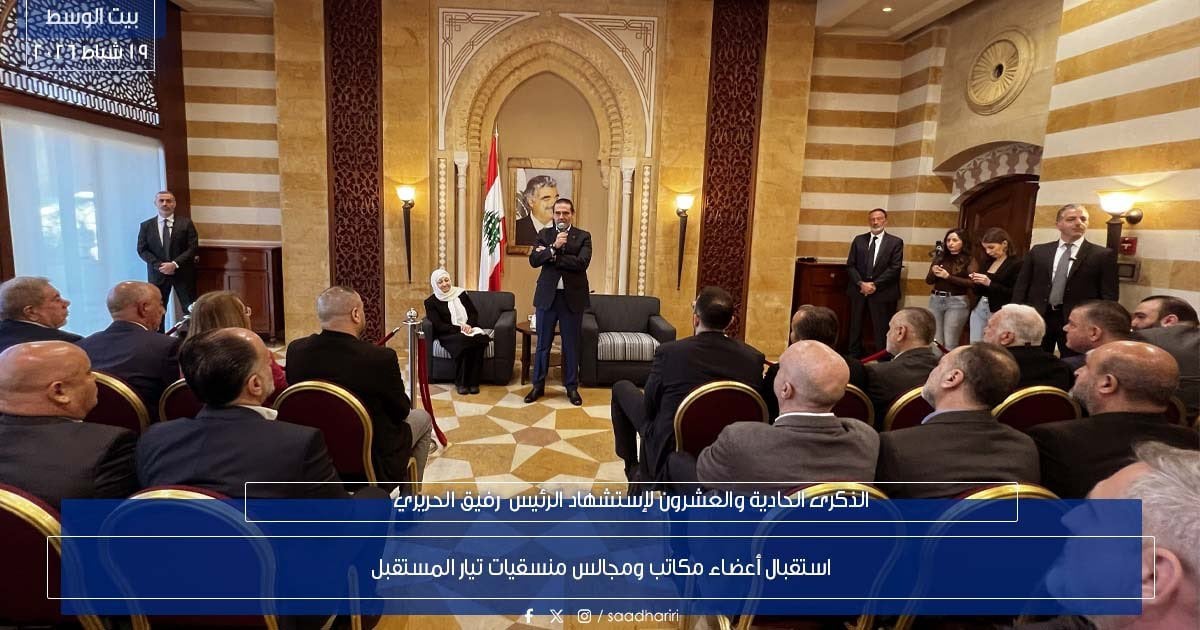 استقبل الرئيس سعد الحريري أعضاء مكاتب ومجالس منسّقيات تيار المستقبل في بيروت والبقاعين الغربي والأوسط وعرسال وبعلبك وجبل لبنان الجنوبي وصيدا والجنوب وشبعا والعرقوب، وذلك في حضور نائبة رئيس التيار بهية الحريري والأمين العام أحمد الحريري.