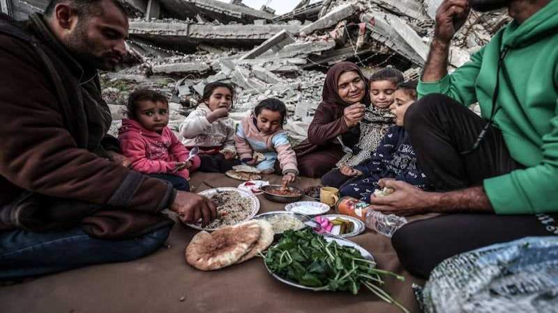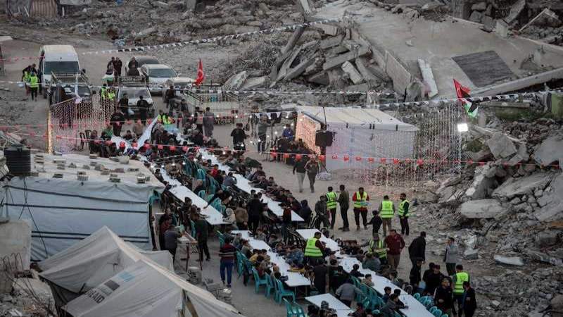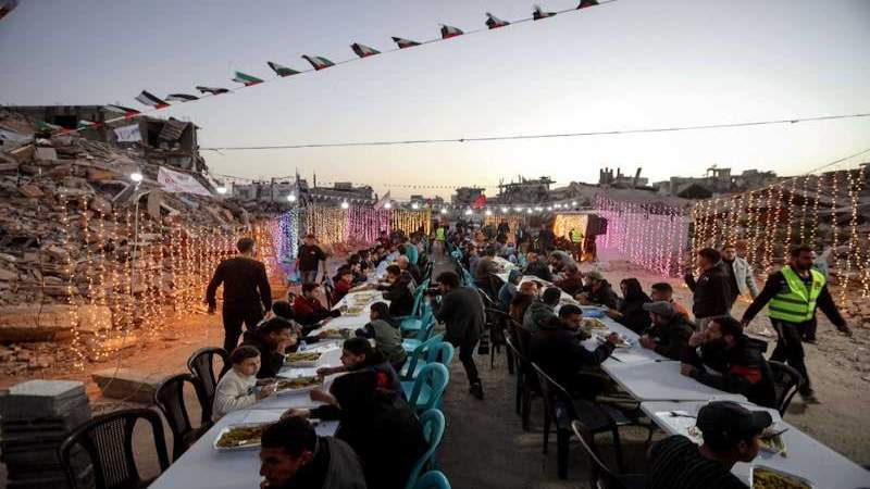 غزة: في أول أيام شهر رمضان، نظمت مؤسسات وجمعيات خيرية موائد إفطار جماعية في أحياء مدمرة بقطاع غزة، أقيمت بين أنقاض مبانٍ متصدعة خلفتها حرب الإبادة الجماعية التي شنتها إسرائيل على مدار عامين.