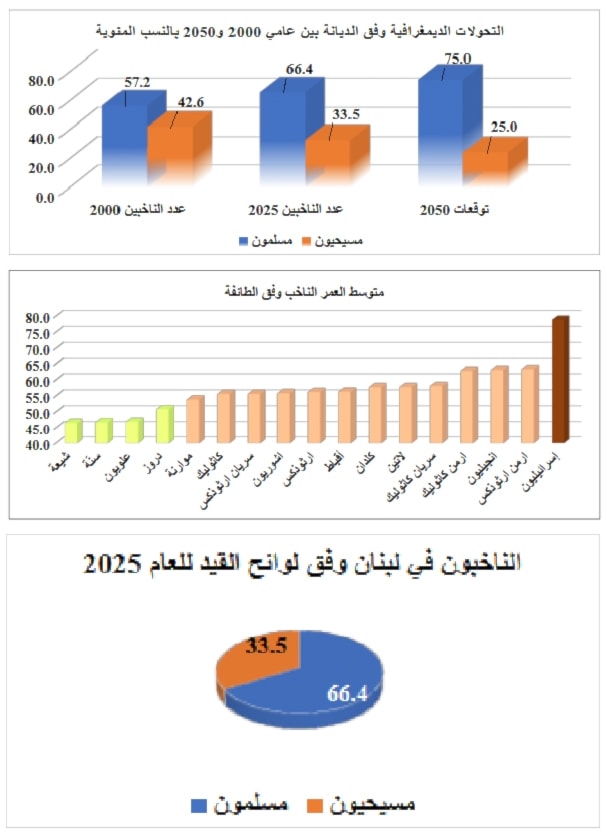 ويكتسب الموضوع بُعداً أكثر خطورة عند التوقف عند تطوّر أعداد الناخبين بحسب الانتماء الديني بين عامَي 2000 و2025. فقد ارتفع عدد الناخبين المسلمين بنسبة 71%، فيما لم تتجاوز الزيادة لدى الناخبين المسيحيين 14% فقط. وإذا استمر المسار على هذا النحو، يُتوقَّع أن تنخفض حصة الناخبين المسيحيين إلى نحو 25% من إجمالي الهيئة الناخبة.