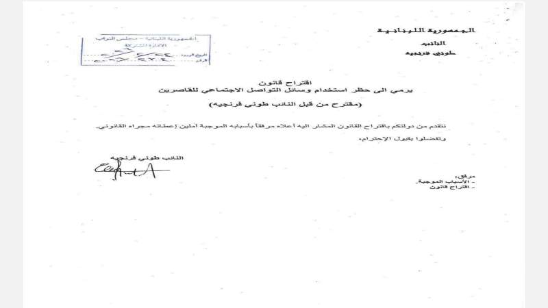 أعلن النائب طوني فرنجيه أنّه تقدّم اليوم باقتراح قانون يحظر استخدام وسائل التواصل الإجتماعي من قبل الاولاد دون الـ 14 عاماً.