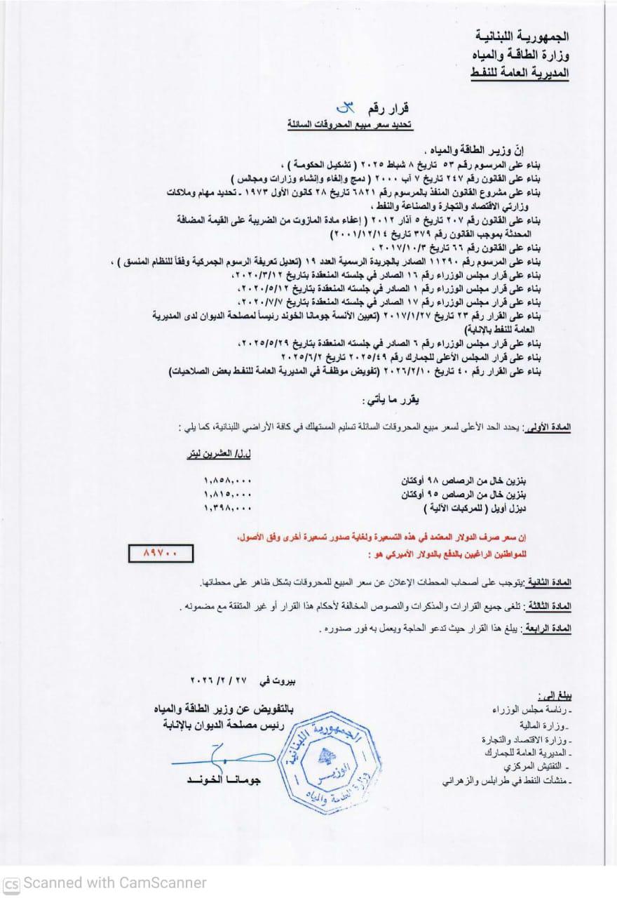 صدر عن وزارة الطاقة والمياه صباح اليوم الجمعة, جدولٌ جديد للمحروقات، وجاءت الأسعار على الشّكل التالي: