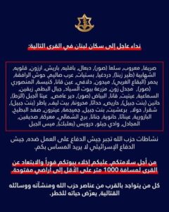 “إلى سكّان لبنان الذين أخلوا منازلهم الليلة الماضية حفاظًا على سلامتهم: غارات جيش الدفاع مستمرّة فمن أجل سلامتكم وسلامة أبناء عائلاتكم – لا تعودوا إلى منازلكم”.