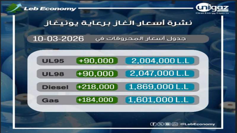 ارتفع اليوم، سعر صفيحتي البنزين 95 و98 أوكتان 90 الف ليرة والمازوت 218 الف ليرة والغاز 184 ألف ليرة، وأصبحت الأسعار على الشكل التالي: