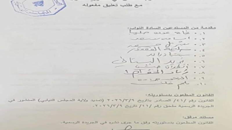 وقعت مع مجموعة من الزملاء النواب من مختلف المشارب ، على طلب مراجعة الطعن بالقانون رقم ٤١ تاريخ ٩ - ٣ - ٢٠٢٦ ، المتعلق بتمديد ولاية المجلس النيابي.