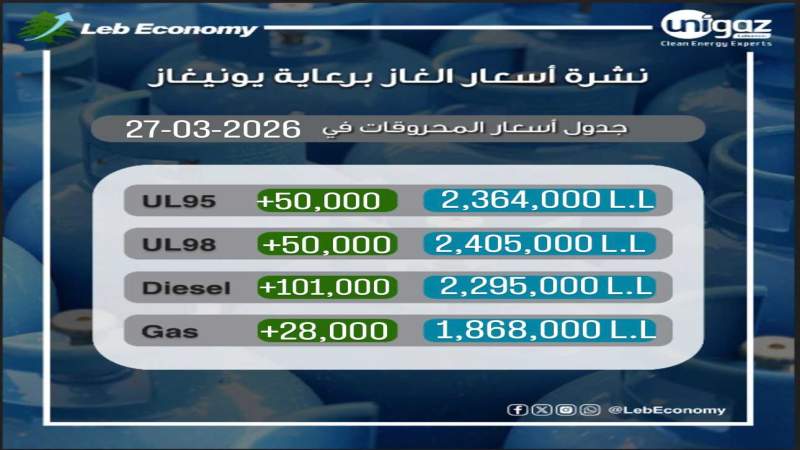 ارتفع اليوم، الجمعة السابع والعشرين من آذار 2026، سعر صفيحتي البنزين 95 و98 أوكتان 50,000 ليرة كما ارتفع سعر المازوت 101,000 ليرة وسعر الغاز 28,000 ليرة، وجاءت الاسعار على الشكل الآتي: