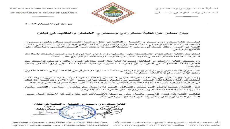 اجتمعت نقابة مستوردي ومصدّري الخضار والفاكهة في لبنان برئاسة النقيب نعيم صالح خليل, وبحضور الأعضاء المسجّلة أسماؤهم في سجلّ الحضور, وذلك يوم الثلاثاء الواقع فيه 7 نيسان 2026, في مكتب النقابة في الحمرا وذلك للبحث في موضوع البطاطا المصريّة وإقفال معبر المصنع الحدودي وتداعياته على القطاع الزراعي.