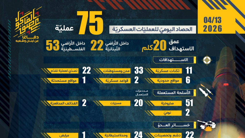 وقال "حزب الله": "دفاعا عن لبنان وشعبه، ردا على خرق العدو لاتفاق وقف إطلاق النار، واعتداءاته المتكررة على قرى الجنوب، وبعدما التزمت المقاومة بوقف النار ولم يلتزم به العدو، أصدرت المقاومة الإسلامية بتاريخ الاثنين 13 أبريل 2026، 47 بيانا عسكريا حول عمليات التصدي لتحركات العدو الإسرائيلي عند الحدود اللبنانية الفلسطينية، وكذلك عمليات استهداف مواقع وقواعد وانتشار جيش العدو الإسرائيلي ومستعمراته في شمال فلسطين المحتلة، وفقا للآتي":