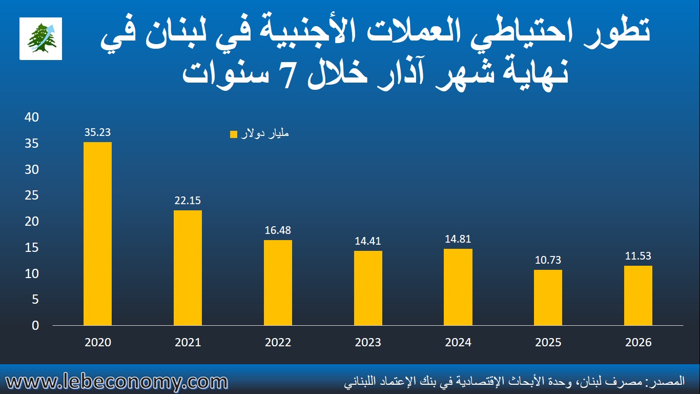 تُظهِر ميزانيّة مصرف لبنان إنخفاض في الموجودات الخارجيّة بالعملات الأجنبيّة بمبلغٍ قدره 130.86 مليون د.أ. (1.12%) خلال النصف الثاني من شهر آذار 2026 إلى 11.53 مليار د.أ. (1،032.33 ترليون ل.ل.)، مقارنةً مع 11.67 مليار د.أ. (1،044.04 ترليون ل.ل.) قبل فترة أسبوعين. يجدر الذكر أنّ الموجودات الخارجيّة بالعملات الأجنبيّة لدى مصرف لبنان قد شهدت زيادة مضطردة خلال الفترة الممتدّة بين بداية شهر آب 2023 (أيّ عند نهاية ولاية الحاكم السابق رياض سلامة) ونهاية شهر آذار 2026 بلغت قيمتها الإجماليّة حوالي 2.96 مليار د.أ. عقب سياسة مصرف لبنان النقديّة الجديدة القاضية بالإمتناع عن تسليف الحكومة ورفع الدعم عن معظم السلع والحدّ من طبع العملة المحليّة.