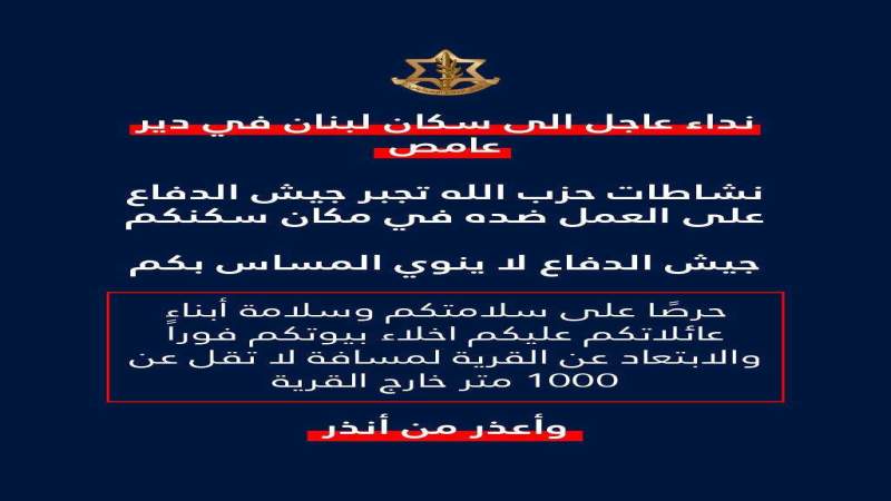 في تصعيد خطير، وجه المتحدث باسم الجيش الإسرائيلي أفيخاي أدرعي انذاراً عاجلاً إلى سكان لبنان المتواجدين في بلدة دير عامص. وقال في بيان: "نشاطات حزب الله وقيامه بعمليات الإطلاق من بلدتكم تجبر الجيش على العمل ضده في مكان سكنكم. حرصاً على سلامتكم وسلامة أبناء عائلاتكم عليكم اخلاء بيوتكم فوراً والابتعاد عن القرية لمسافة لا تقل عن 1000 متر خارج القرية".