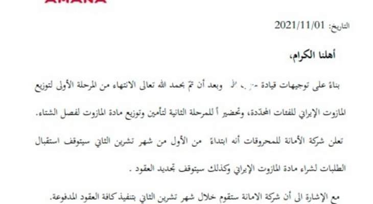 أعلنت "شركة الأمانة للمحروقات" أنها ستُوقف ابتداءً من اليوم "استقبال الطلبات لشراء مادة المازوت الإيراني"، وكذلك "تجديد العقود".