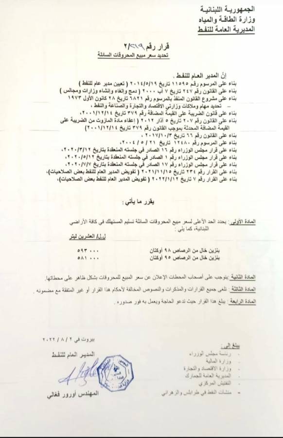 أصدرت المديرية العامة للنفط في وزارة الطاقة اليوم جدولاً جديداً لتركيب أسعار المحروقات، وجاءت الأسعار على الشكل التالي: