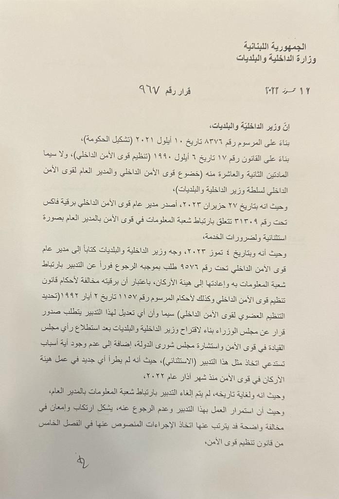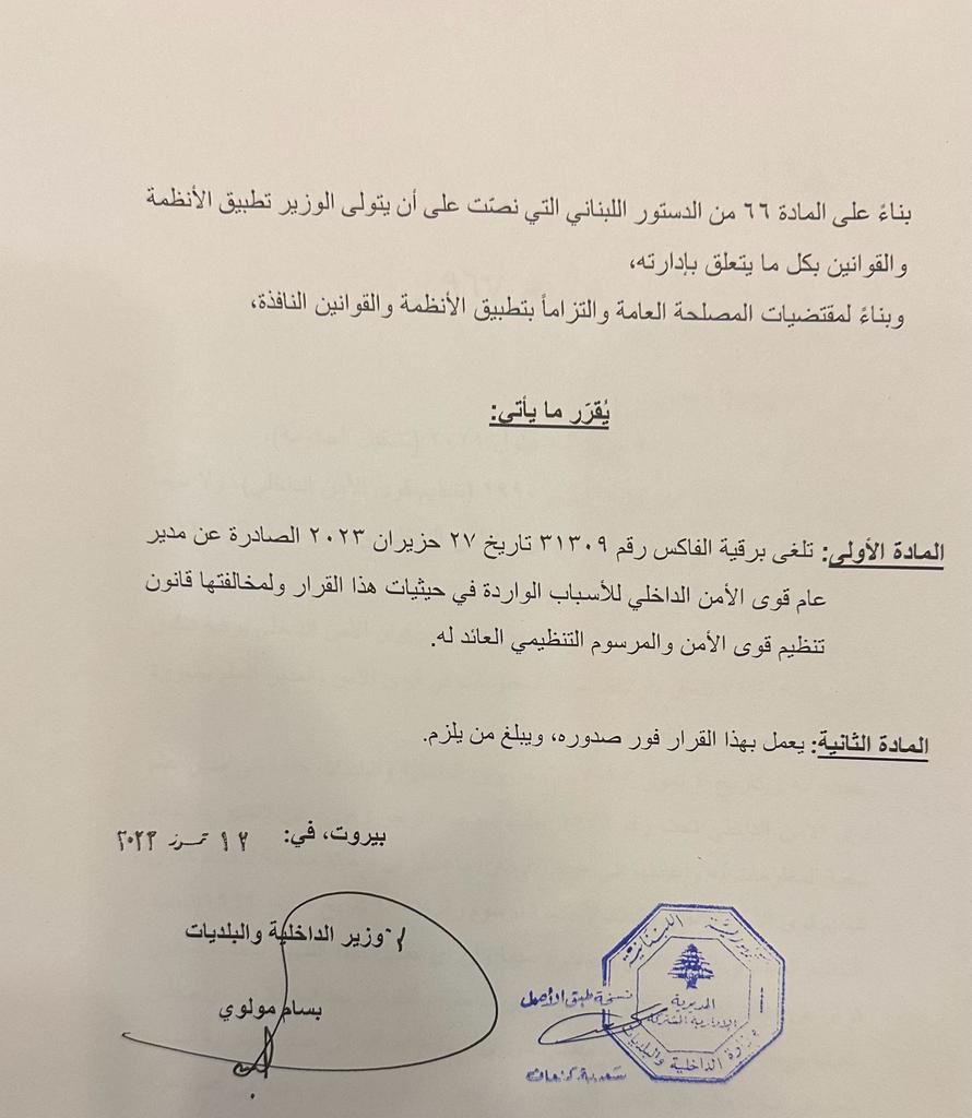 أصدر وزير الداخلية والبلديات بسام مولوي قراراً ألغى بموجبه البرقية الصادرة عن مدير عام قوى الأمن الداخلي اللواء عماد عثمان بربط شعبة المعلومات بعثمان بصورة استثنائية ولضرورات الخدمة.