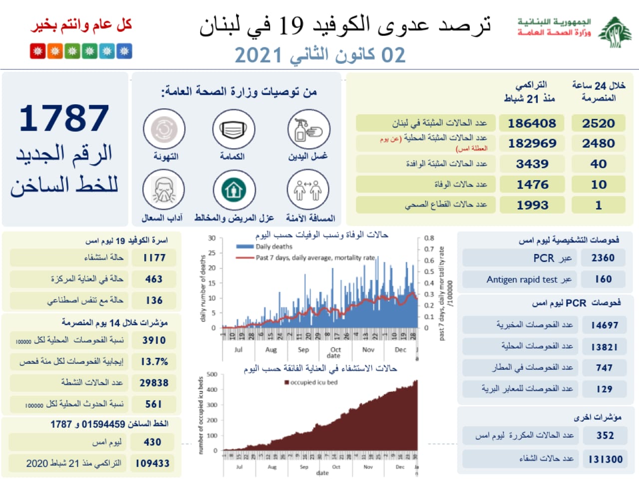 أعلنت وزارة الصحة العامة تسجيل 2520 إصابة جديدة بفيروس “كورونا” في لبنان، ما يرفع العدد الإجمالي للمصابين إلى 186408.