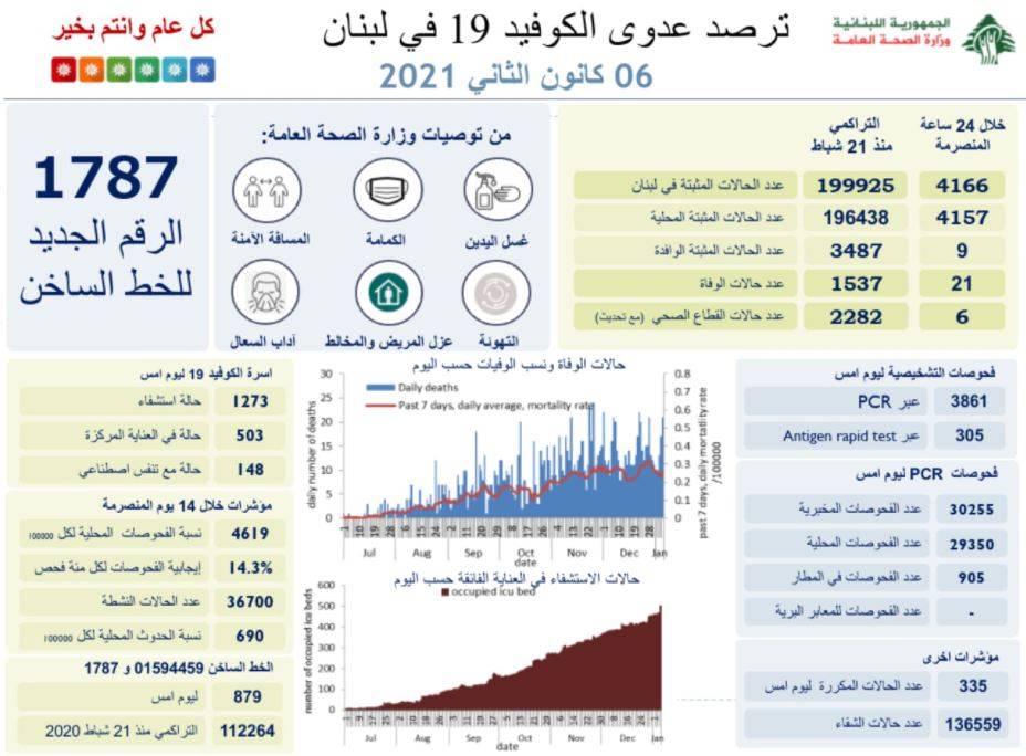 اعلنت وزارة الصحة العامة تسجيل 4166 اصابة كورونا جديدة رفعت العدد التراكمي للحالات المثبتة الى 199925. كما تم تسجيل 21 حالة وفاة.