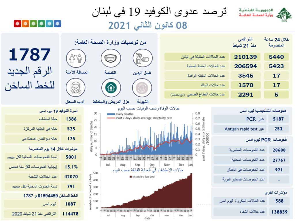 أعلنت وزارة الصحة العامة تسجيل 5440 إصابة جديدة بفيروس “كورونا” في لبنان، ما يرفع العدد الإجمالي للإصابات إلى 210139.