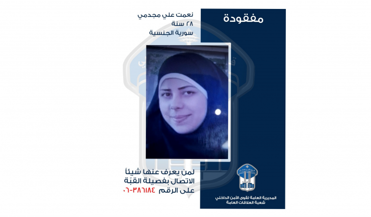 صــدر عــــن المديريّـة العـامّـة لقــوى الأمــن الـدّاخلي ـ شعبة العـلاقـات العـامّـة البــــــلاغ التّالــــــي: "تُعمّم المديرية العامة لقوى الأمن الداخلي بناءً على إشارة القضاء المختص صورة المفقودة نعمت علي مجدمي (مواليد عام 1996، سوريّة)، التي غادرت منزلها الزوجي الكائن في طرابلس – محلّة القبّة، حوالى الساعة 05،00 من تاريخ 10/03/2024، ولم تَعُد لغاية تاريخه.