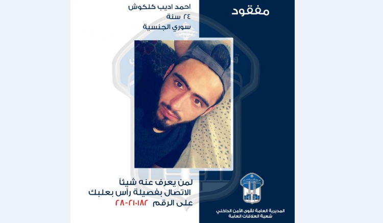 صدر عن المديرية العامة لقوى الأمن الداخلي ـ شعبة العلاقات العامة البلاغ التالي: تُعمِم المديرية العامة لقوى الأمن الداخلي، بناءً على إشارة القضاء المختص، صورة المفقود احمد اديب كلكوش (من مواليد عام 2000، سوري)، الذي غادر بتاريخ 31-3-2024 مكان اقامته الكائن في محلة جديدة الفاكهة، ولم يعد لغاية تاريخه.
