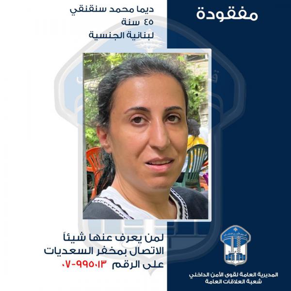 صــدر عــــن المديريّـة العـامّـة لقــوى الأمــن الـدّاخلي ـ شعبة العـلاقـات العـامّـة البــــــلاغ التّالــــــي: "تُعمّم المديرية العامة لقوى الأمن الداخلي بناءً على إشارة القضاء المختص صورة المفقودة ديما محمد سنقنقي (مواليد عام 1979، لبنانية)،التي غادرت منزلها الزوجي الكائن في السعديات بتاريخ 08-04-2024، ولم تَعُد لغاية تاريخه. علمًا أنها تعاني من أمراض عصبية.