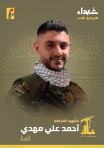 بمزيد من الفخر والإعتزاز، تزف المقاومة الإسلامية الشهيد المجاهد أحمد علي مهدي “زين” مواليد عام 1991 من بلدة عدشيت في جنوب لبنان، والذي ارتقى شهيداً على طريق القدس.
